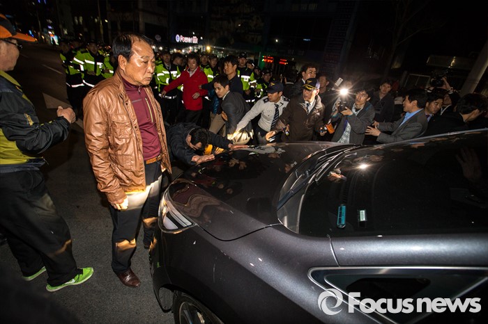 (대구=포커스뉴스) 김무성 새누리당 대표가 30일 오후 대구 수성구 새누리당 대구시당에서 열린 '선거대책위원회의'에 참석해 회의를 마친 뒤 차량에 탑승해 이동하자 이재만 새누리당 대구 동구을 예비후보 지지자들이 김 대표의 사퇴를 요구하며 저지하고 있다.