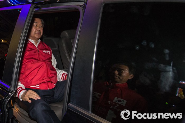 (대구=포커스뉴스) 김무성 새누리당 대표가 30일 오후 대구 동구 새누리당 동구갑 정종섭 후보 선거사무소를 방문한 뒤 동대구역으로 이동하기 위해 차량에 탑승 하고 있다.