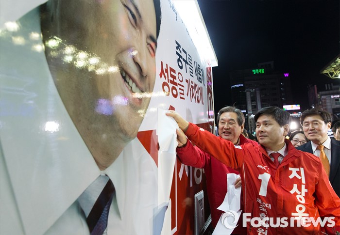 (서울=포커스뉴스) 4.13총선 공식선거운동 첫날인 31일 오전 서울 중구 동대문 누죤 앞에서 김무성 새누리당 공동선대위원장이 지상욱 서울 중구성동구을 후보와 선거유세차량 가림막을 제거하고 있다.