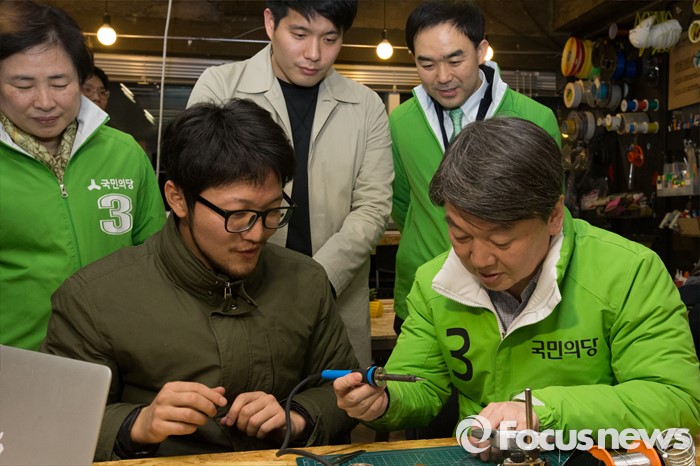 (서울=포커스뉴스) 4.13총선 공식선거운동 첫날인 31일 오전 서울 종로구 세운전자상가 '팹랩 서울(FABLAB SEOUL)'에서 안철수 국민의당 상임공동대표가 미래 일자리 청년 아카데미를 방문해 납땜을 체험하고 있다.