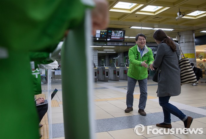 (서울=포커스뉴스) 총선 선거운동이 공식적으로 시작된 31일 오전 안철수 국민의당 노원병 후보가 서울 노원구 수락산역 역사 내에서 지역 주민들에게 출근 인사를 하고 있다.