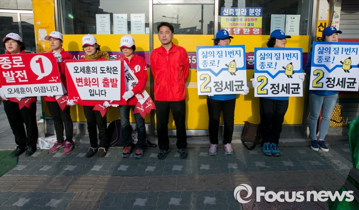 (서울=포커스뉴스) 20대 총선 공식선거 운동이 시작된 31일 오전 서울 동묘앞역 인근 거리에서 오세훈 새누리당, 정세균 더불어민주당 서울 종로구 후보의 선거운동원들이 지지를 호소하고 있다.
