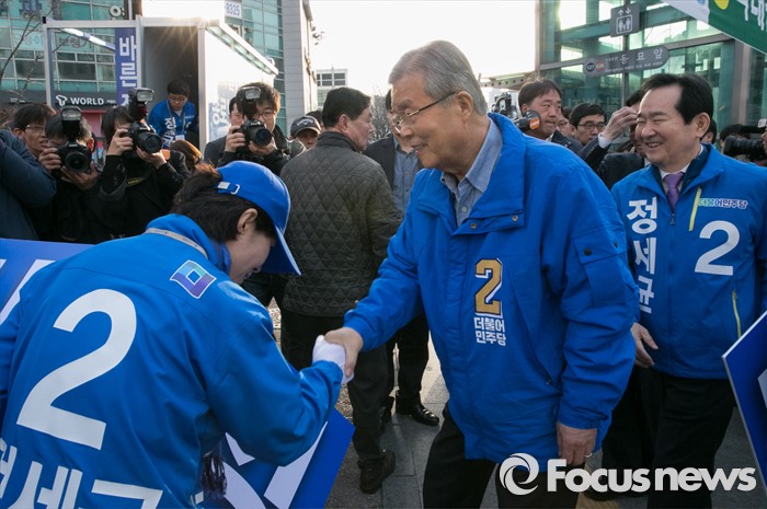 (서울=포커스뉴스) 20대 총선 공식선거 운동이 시작된 31일 오전 서울 동묘앞역 인근 거리에서 김종인(가운데) 더불어민주당 비대위 대표 겸 선대위원장과 정세균 서울 종로구 후보가 선거운동원들을 격려하고 있다.