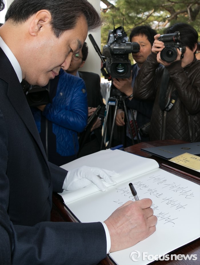 (서울=포커스뉴스) 4.13 총선 공식선거운동이 시작된 31일 오전 서울 동작구 국립현충원에서 김무성 새누리당 대표가 참배를 마친 뒤, 방명록을 작성하고 있다.
