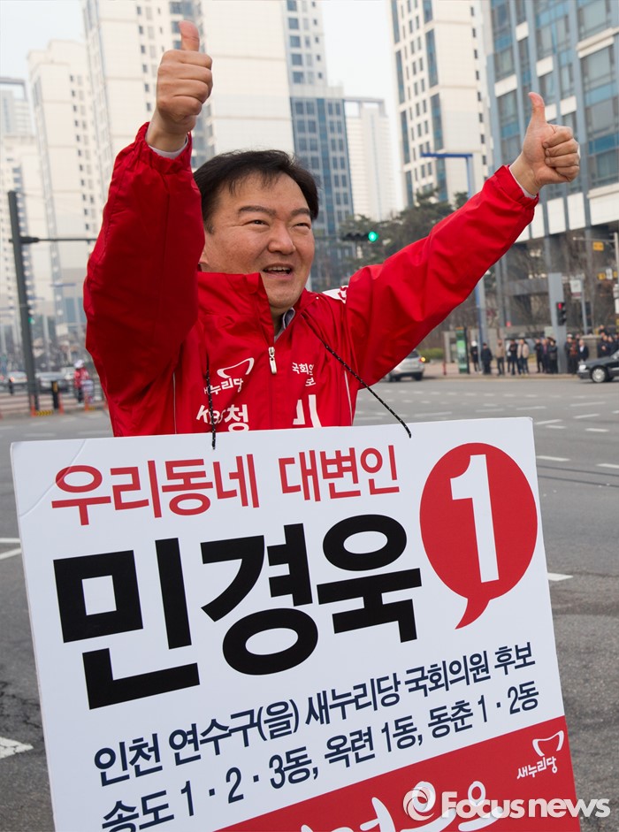 (인천=포커스뉴스) 제20대 총선 선거운동이 공식적으로 시작된 31일 오전 인천 연수구 한 사거리에서 민경욱 새누리당 연수을 후보가 출근하는 시민들에게 인사하며 지지를 호소하고 있다.