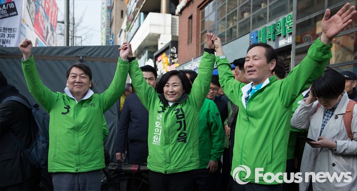 (서울=포커스뉴스) 총선 선거운동이 공식적으로 시작된 31일 오전 안철수 국민의당 상임공동대표(왼쪽)가 서울 강북구 수유동에서 김기옥 강북갑 후보(가운데) 지원 유세를 하고 있다.