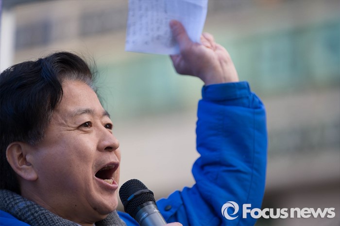 (서울=포커스뉴스) 20대 총선 공식선거 운동이 시작된 31일 오전 서울 마포구 공덕오거리에서 노웅래 더불어민주당 마포갑 후보가 출정식을 하고 있다.