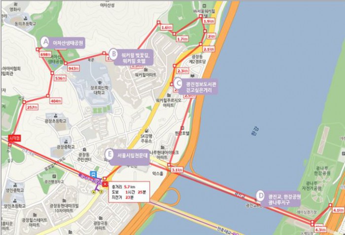 김태호 서울도시철도공사 사장은 "지하철만큼 서울의 어제와 오늘을 함께하며 도시와 사람을 아우르는 교통수단은 없을 것"이라며 "지하철을 타고 서울의 새로운 매력을 만날 수 있도록 지속적으로 노력하겠다"고 말했다.31일 서울도시철도공사에서 소개한 '5678 지하철 도보여행' 관광코스 중 '5호선 광나루역 코스' 지도. <사진제공=서울도시철도공사>
