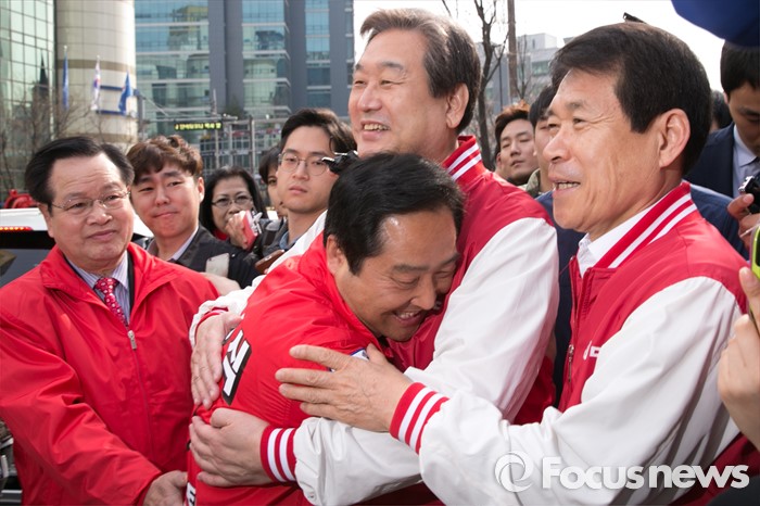 (서울=포커스뉴스) 4.13 총선 공식선거운동이 시작된 31일 오전 서울 구로구 구로디지털단지역 인근 한 대형마트 앞에서 김무성(오른쪽 두번째) 새누리당 대표와 강요식(왼쪽 두번째) 구로을 후보가 포옹하고 있다. 오른쪽은 이군현 공동총괄본부장.