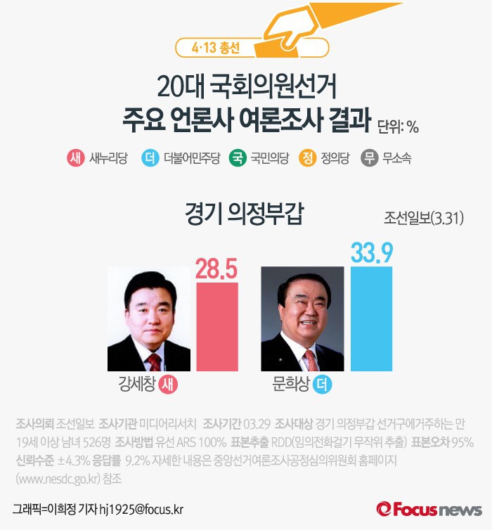 (서울=포커스뉴스) 조선일보가 미디어리서치에 의뢰해 31일 발표한 여론조사 결과에 따르면 새누리당 강세창후보의 지지율은 28.5%, 더불어민주당 문희상후보는 33.9%를 기록했다.