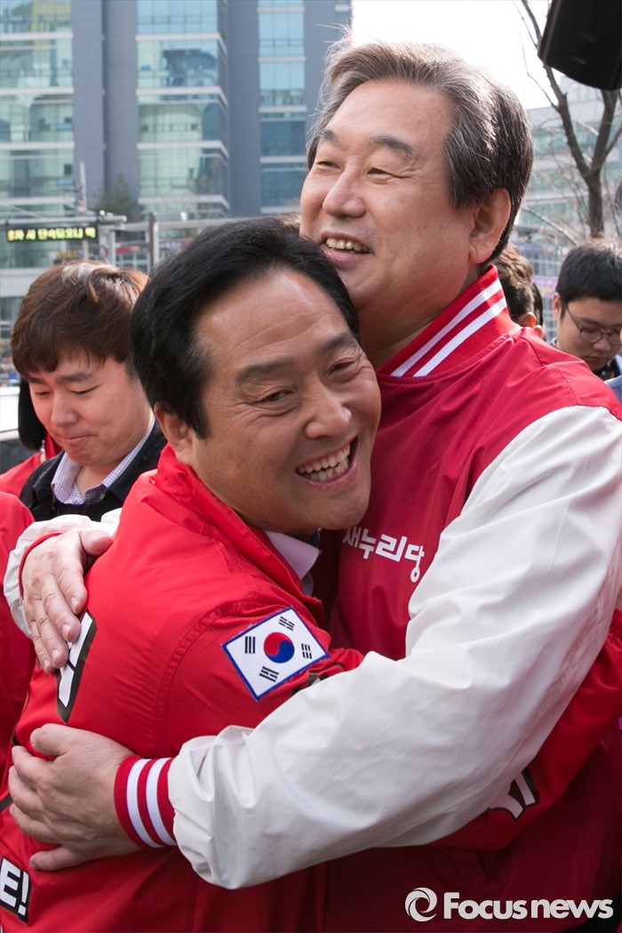 (서울=포커스뉴스) 4.13 총선 공식선거운동이 시작된 31일 오전 서울 구로구 구로디지털단지역 인근 한 대형마트 앞에서 김무성(오른쪽) 새누리당 대표와 강요식 구로을 후보가 포옹하고 있다.
