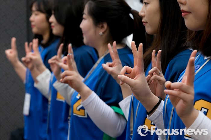 (서울=포커스뉴스) 20대 총선 공식선거 운동이 시작된 31일 오전 서울 남대문시장에서 열린 더불어민주당 중앙선거대책위원회 출정식에 참석한 선거운동원들이 기호 2번을 뜻하는 브이 표시를 하고 있다.