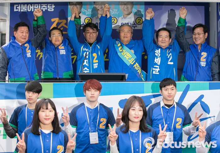 (서울=포커스뉴스) 20대 총선 공식선거 운동이 시작된 31일 오전 서울 남대문시장에서 열린 더불어민주당 중앙선거대책위원회 출정식에 참석한 김종인 비대위 대표 겸 선대위원장 등 후보 및 선대위 관계자들이 손을 들어 포즈를 취하고 있다. 왼쪽부터 이근식 서울부위원장, 송현섭 실버위원장, 이지수 중구성동을 후보, 김 대표, 정세균 종로구 후보, 오영식 유세단장.