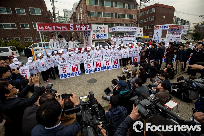 (대구=포커스뉴스) 무소속 대구 동구을 유승민(가운데) 후보, 무소속 대구 북구갑 권은희(오른쪽) 후보, 무소속 대구 동구갑 류성걸 후보가 31일 오전 대구 동구 공항교에서 열린 공동 출정식에 참석 하고 있다.
