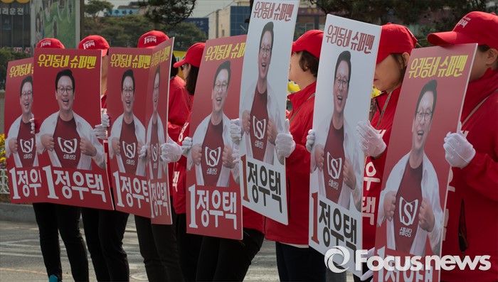 (청주=포커스뉴스) 20대 국회의원 선거유세가 시작된 31일 오전 충북 청주시 사직동 분수대 앞에서 정우택 후보 선거유세원들이 지지를 호소하고 있다.