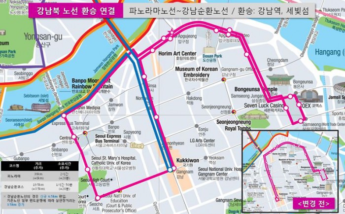 강남구 내에서만 운행하던 강남순환노선도 서초구까지 코스를 연장하고 세빛섬, 고속터미널, 서래마을, 법원‧교대역 등을 경유지로 추가된다.