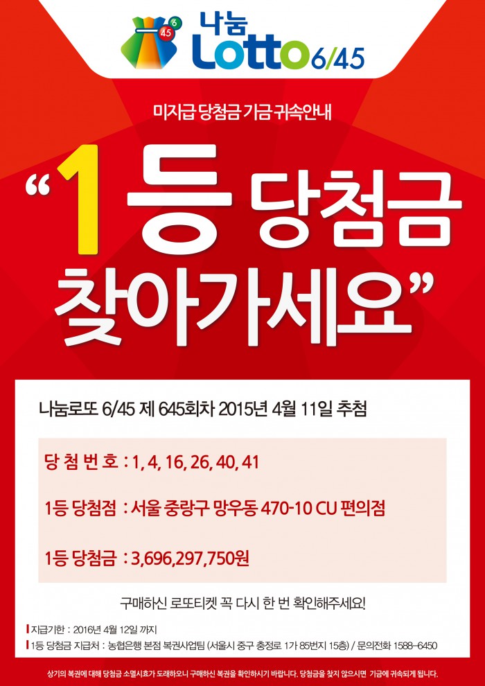 645회 당첨금 지급기한은 오는 4월 12일까지, 646회 당첨금 지급기한은 오는 4월 19일까지 등이다.