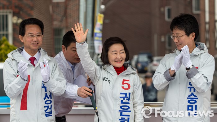 (대구=포커스뉴스) 무소속 대구 북구갑 권은희 후보가 31일 오전 대구 동구 공항교에서 열린 선거운동 출정식에 참석해 손을 흔들며 지지자들에게 인사 하고 있다.