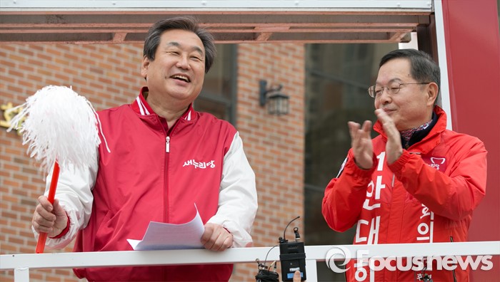 (서울=포커스뉴스) 4.13 총선 공식선거운동이 시작된 31일 오전 서울 마포구 아현시장에서 김무성(왼쪽) 새누리당 대표가 안대희 마포갑 후보와 함께 유세 차량에 올라, 먼지털이를 들고 웃고 있다.