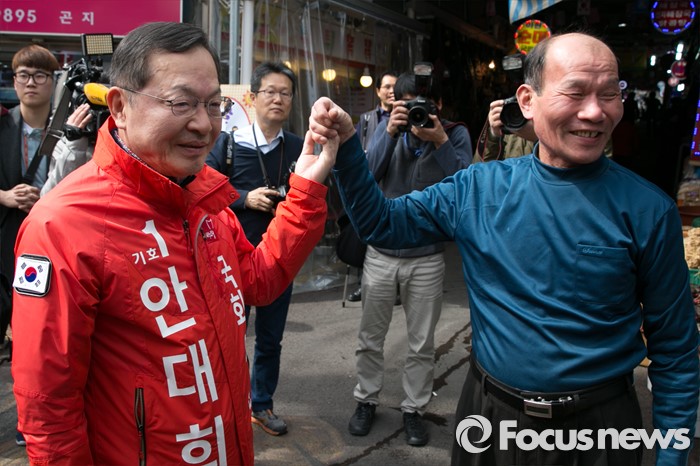 (서울=포커스뉴스) 4.13 총선 공식선거운동이 시작된 31일 오전 서울 마포구 아현시장에서 안대희 새누리당 마포갑 후보가 시민들과 인사하고 있다.