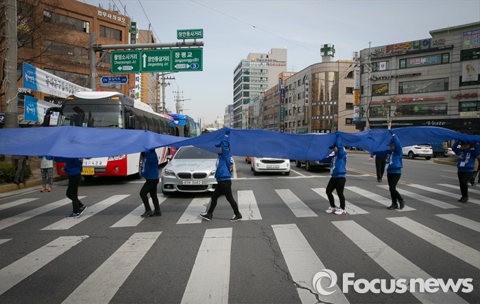(서울=포커스뉴스) 20대 총선 공식선거 운동이 시작된 31일 오전 서울 장안동사거리에서 열린 민병두 더불어민주당 동대문을 후보 출정식에 참여한 선거운동원들이 퍼포먼스를 하고 있다.