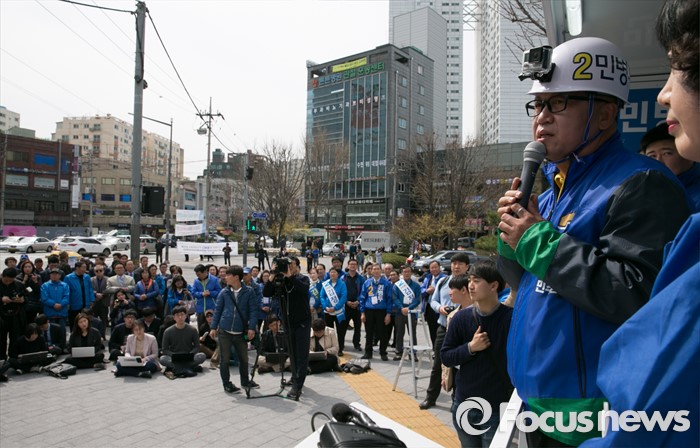 (서울=포커스뉴스) 20대 총선 공식선거 운동이 시작된 31일 오전 서울 장안동사거리에서 열린 민병두 더불어민주당 동대문을 후보 출정식에 참석한 민 후보가 지지를 호소하고 있다.