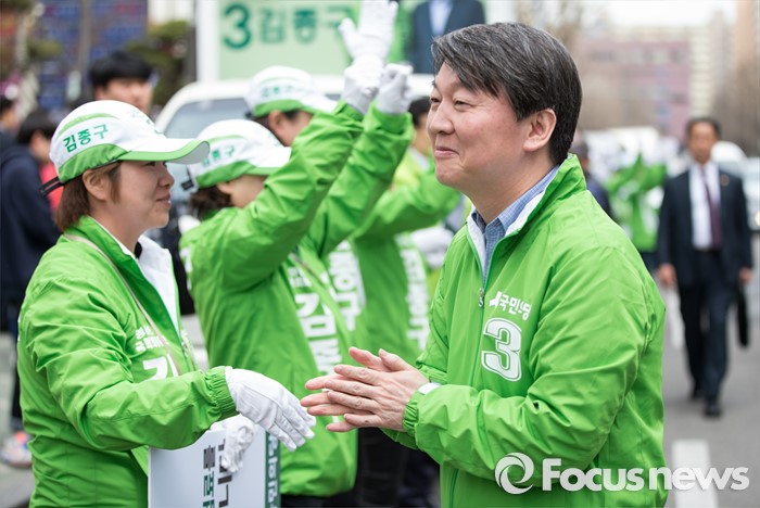 (서울=포커스뉴스) 총선 선거운동이 공식적으로 시작된 31일 오후 안철수 국민의당 상임공동대표가 서울 영등포구 여의도백화점 앞에서 김종구 영등포을 후보 지원 유세를 하던 중 선거운동 봉사자들과 인사를 나누고 있다.