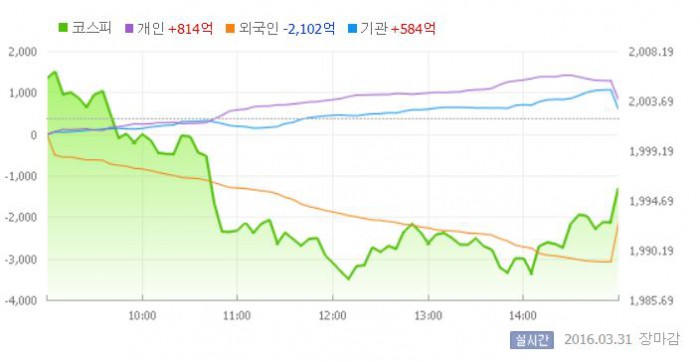 31일 코스피지수는 전일 대비 0.31%(6.29포인트) 내린 1995.85에 장을 마쳤다. 코스닥지수는 전날 보다 0.40%(2.75포인트) 하락한 688.38에 마감했다.