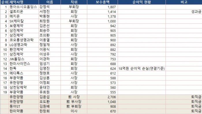 이어 △박동현 메지온 사장(13억7800만원) △최창원 SK케미칼 부회장(10억원) △김은선 보령제약 회장(9억4200만원) △최승주·조의환 삼진제약 공동회장(9억500만원) △이웅열 코오롱생명과학 회장(9억원) △정일재 LG생명과학 사장(8억9200만원) △이광식 환인제약 회장(8억8200만원) 순이었다.