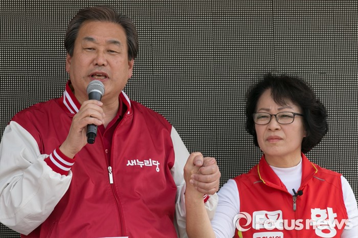 (서울=포커스뉴스) 4.13 총선 공식선거운동이 시작된 31일 오후 서울 용산구 후암시장 앞에서 김무성(왼쪽) 새누리당 대표가 황춘자 용산 후보 지원유세를 하고 있다.