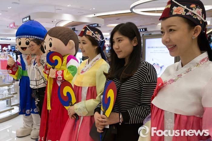 (서울=포커스뉴스) 한국을 방문 중인 중국 아오란 그룹 임직원 6000여 명이 31일 오후 서울 용산구의 한 면세점을 찾아 홍보모델들과 기념촬영을 하고 있다.