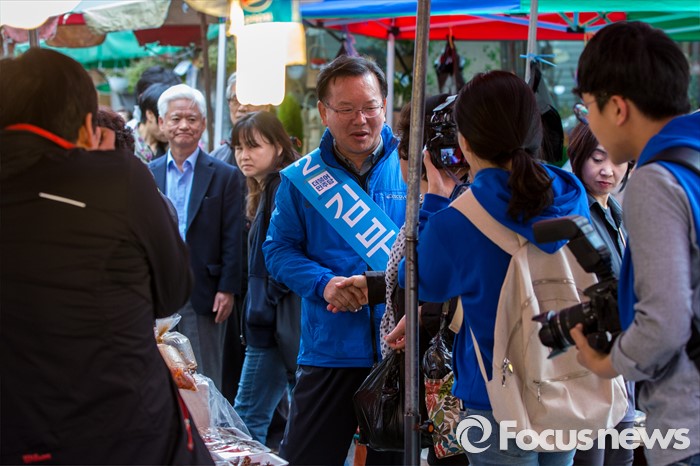(대구=포커스뉴스) 더불어민주당 대구 수성구갑 김부겸 후보가 31일 오후 대구 수성구 신매시장을 방문해 유권자들에게 한 표를 호소 하고 있다.