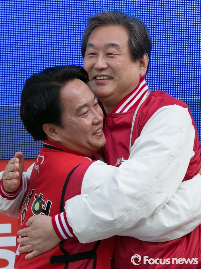 (서울=포커스뉴스) 4.13 총선 공식선거운동이 시작된 31일 오후 서울 서대문구 독립문공원에서 김무성(오른쪽) 새누리당 대표가 이성헌 서대문갑 후보 출정식에 참석해 이 후보를 안고 있다.
