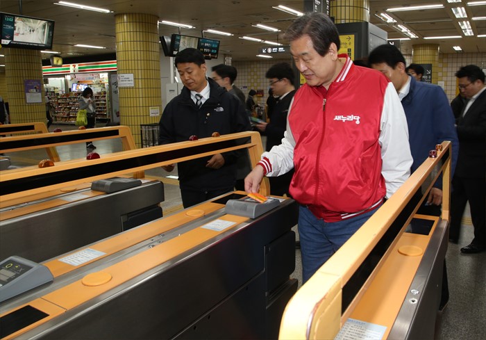 (서울=포커스뉴스) 20대 총선 공식선거 운동이 시작된 31일 오후 지원 유세에 나선 김무성 새누리당 공동선대위원장이 지하철 6호선을 이용해 이동하고 있다. <사진제공=새누리당>