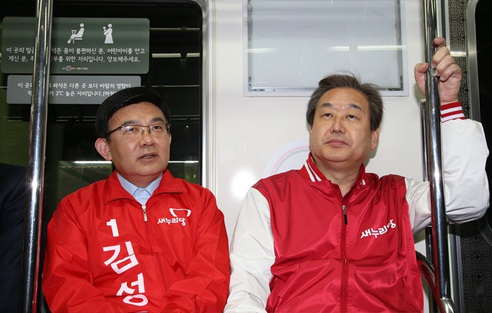 (서울=포커스뉴스) 20대 총선 공식선거 운동이 시작된 31일 오후 지원 유세에 나선 김무성(오른쪽) 새누리당 공동선대위원장과 김성동 마포을 후보가 지하철 6호선 열차에 올라 이동하고 있다. <사진제공=새누리당>
