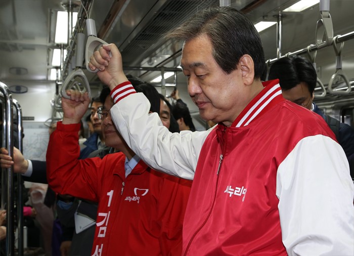 (서울=포커스뉴스) 20대 총선 공식선거 운동이 시작된 31일 오후 지원 유세에 나선 김무성(오른쪽) 새누리당 공동선대위원장과 김성동 마포을 후보가 지하철 6호선 열차에 올라 이동하고 있다. <사진제공=새누리당>