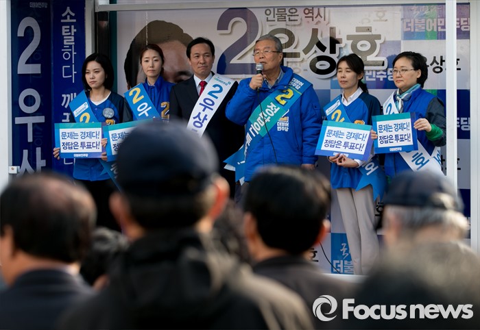 (서울=포커스뉴스) 20대 총선 공식선거 운동이 시작된 31일 오후 서울 신촌 유플렉스 앞에서 김종인(오른쪽 세번째) 더불어민주당 비대위 대표 겸 선대위원장이 우상호(왼쪽 세번째) 서대문갑 후보의 지지를 호소하고 있다.