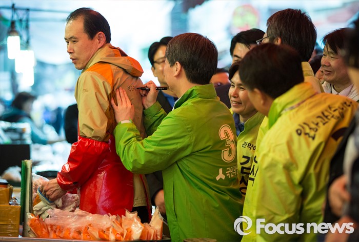 (서울=포커스뉴스) 총선 선거운동이 공식적으로 시작된 31일 오후 안철수 국민의당 상임공동대표가 서울 관악구 관악플라자 앞에서 열린 김성식 관악갑 후보 지원 유세를 마친 후 한 지지자의 등에 사인을 해주고 있다.