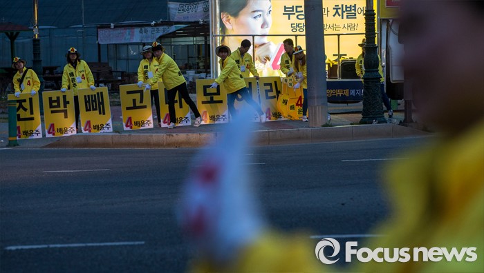 (경산=포커스뉴스) 정의당 경북 경산시 배윤주 후보 선거운동원들이 31일 오후 경북 경산시 중앙병원 네거리에서 유권자들에게 한 표를 호소 하고 있다.