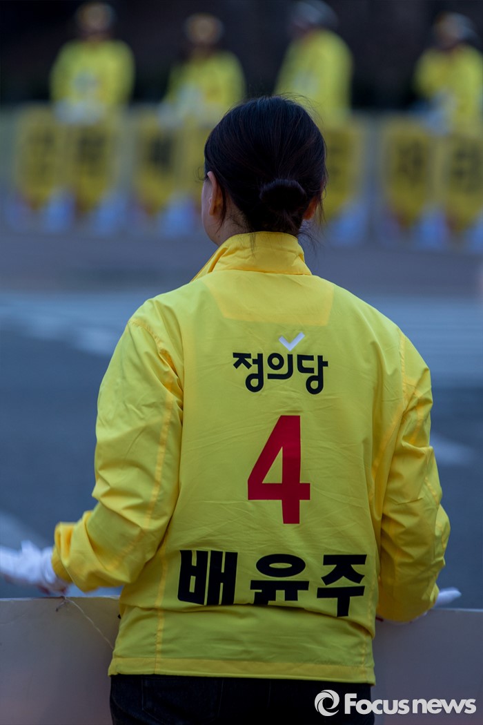 (경산=포커스뉴스) 정의당 경북 경산시 배윤주 후보가 31일 오후 경북 경산시 중앙병원 네거리에서 유권자들에게 한 표를 호소 하고 있다.