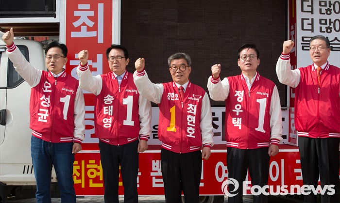 이날 출범식에는 정 후보 외에도 새누리당 송태영(충북 청주흥덕)·오성균(충북 청주청원)·최현호(충북 청주서원) 후보가 참석했다.(청주=포커스뉴스) 20대 국회의원 선거유세가 시작된 31일 오전 충북 청주시 사직동 분수대 앞에서 청주 새누리당 후보자들이 출정식을 갖고 필승을 다짐하고 있다. 2016.03.31 김기태 기자