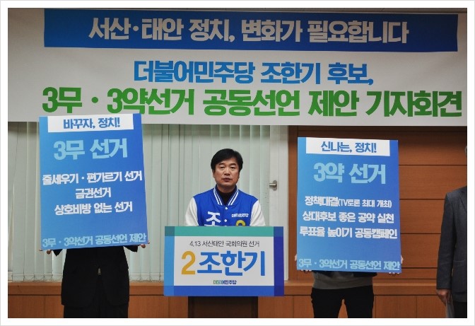 (서울=포커스뉴스) 충남 서산시·태안군에 출마한 조한기 더불어민주당 후보는 성일종 새누리당 후보와 한상율 무소속 후보에 '3무·3약 공동선언'을 제안했다고 31일 밝혔다.