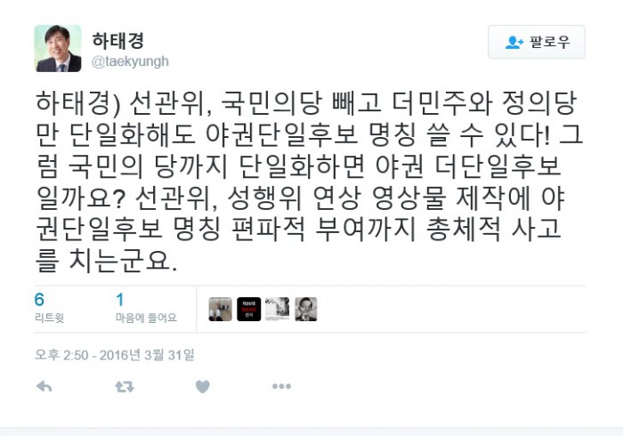 중앙선관위는 최근 걸그룹 AOA의 멤버 설현이 출연한 투표 독려 영상의 성차별 논란으로 구설수에 오르기도 했다.하태경 새누리당 후보가 '야권단일후보' 명칭 사용을 비판하는 글을 트위터에 게재했다. <출처=하태경 후보 트위터>
