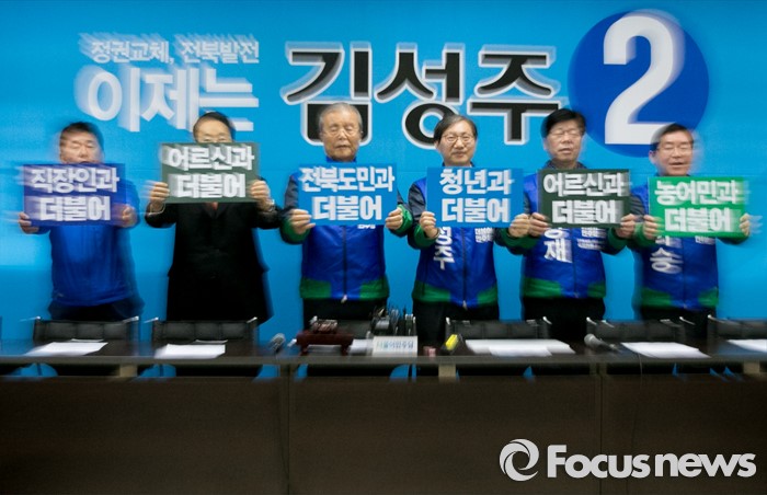 (전주=포커스뉴스) 1일 오전 김성주 더불어민주당 전북 전주병 후보 선거사무소에서 열린 중앙당선거대책위원회의에 참석한 김종인 비대위 대표 겸 선대위원장 등 참석자들이 피켓을 들고 구호를 외치고 있다. 왼쪽부터 이석행, 송현섭 부위원장, 김 대표, 김 후보, 최형재 전주을 후보, 박희승 남원·임실·순창 후보.