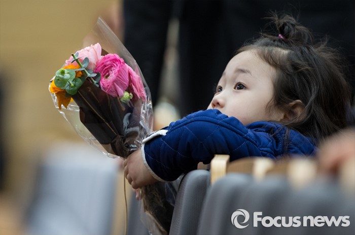 (서울=포커스뉴스) 1일 오전 서울 서초구 대법원 대강당에서 열린 신임 법관 임명식에 참석한 신임 법관의 조카가 꽃다발을 들고 있다.