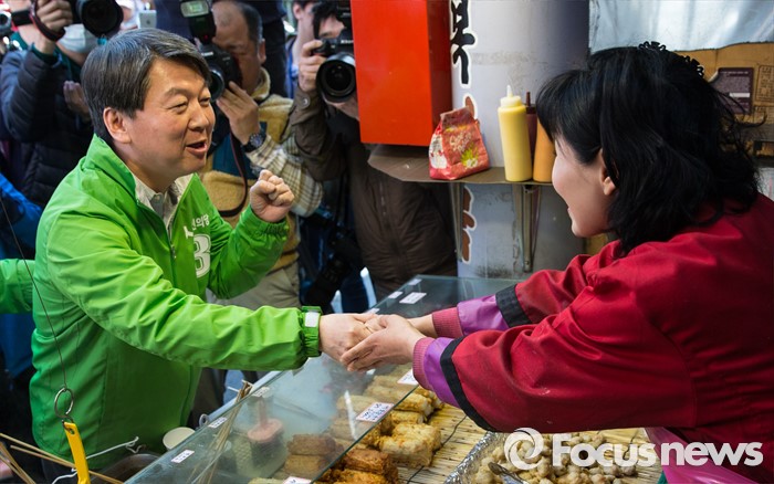 (안양=포커스뉴스) 안철수 국민의당 상임공동대표가 1일 오전 안양시 동안구 중앙시장에서 백종주 동안구갑 후보 지원 유세 중 한 상인과 인사를 나누고 있다.