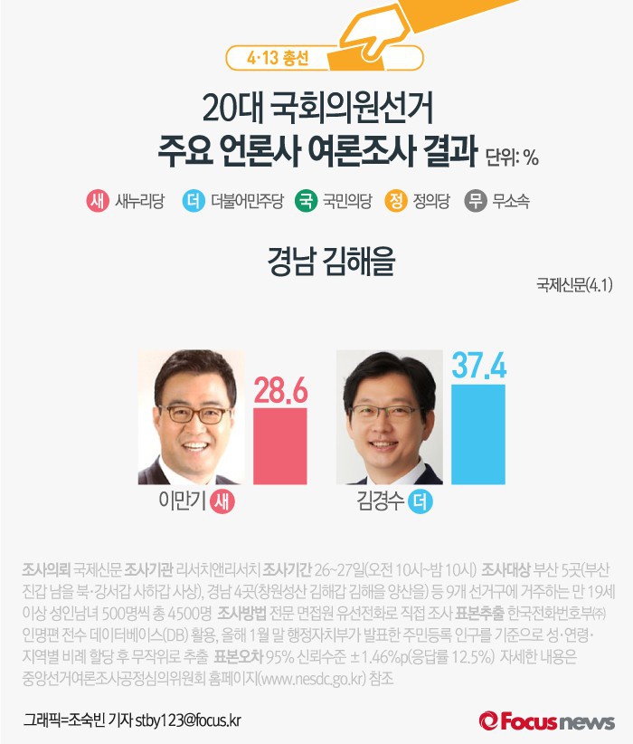 (서울=포커스뉴스) 국제신문이 지난 26, 27일(오전 10시~ 밤 10시) 여론조사 전문기관인 ㈜리서치앤리서치에 의뢰해 경남 4곳(창원성산 김해갑 김해을 양산을) 선거구당 유권자 500명씩을 대상으로 여론조사를 실시한 결과, 김해을의 새누리당 이만기 후보 지지율이 28.6%, 더민주 김경수 후보의 지지율이 37.4%인 것으로 나타났다.