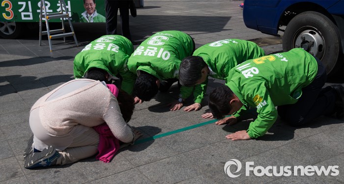 (군포=포커스뉴스) 안철수 국민의당 상임공동대표와 국민의당 후보들이 1일 오전 군포시 산본로데오거리 원형광장에서 정기남 군포시을 후보 지원 유세 중 한 지지자가 큰절을 하자 함께 맞절을 하고 있다.