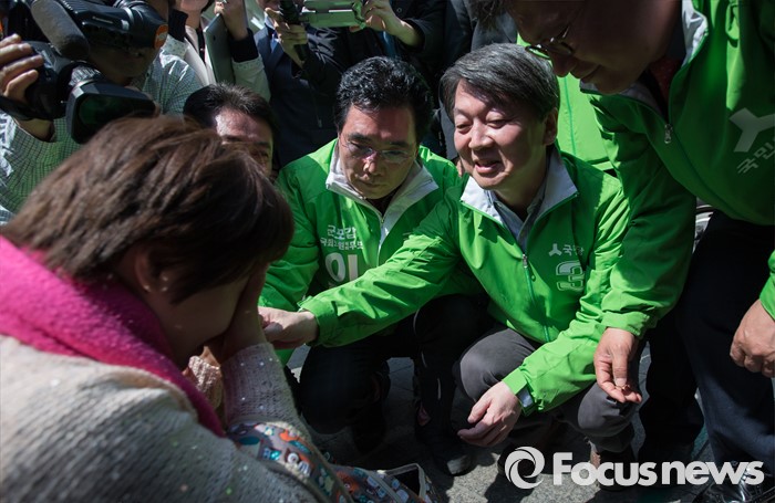 (군포=포커스뉴스) 안철수 국민의당 상임공동대표가 1 일 오전 경기 군포시 산본로데오거리 원형광장에서 정기남 군포시을 후보 지원 유세 중 오열하는 한 여성 지지자를 달래고 있다.