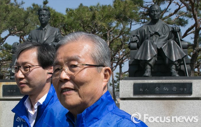 (전주=포커스뉴스) 1일 오전 전북 전주시 덕진공원을 방문한 김종인(오른쪽) 더불어민주당 비대위 대표 겸 선대위원장과 김성주 전주병 후보가 김 대표의 조부인 가인 김병로 선생 등 '법조 3성' 동상을 둘러본 뒤 이동하고 있다.